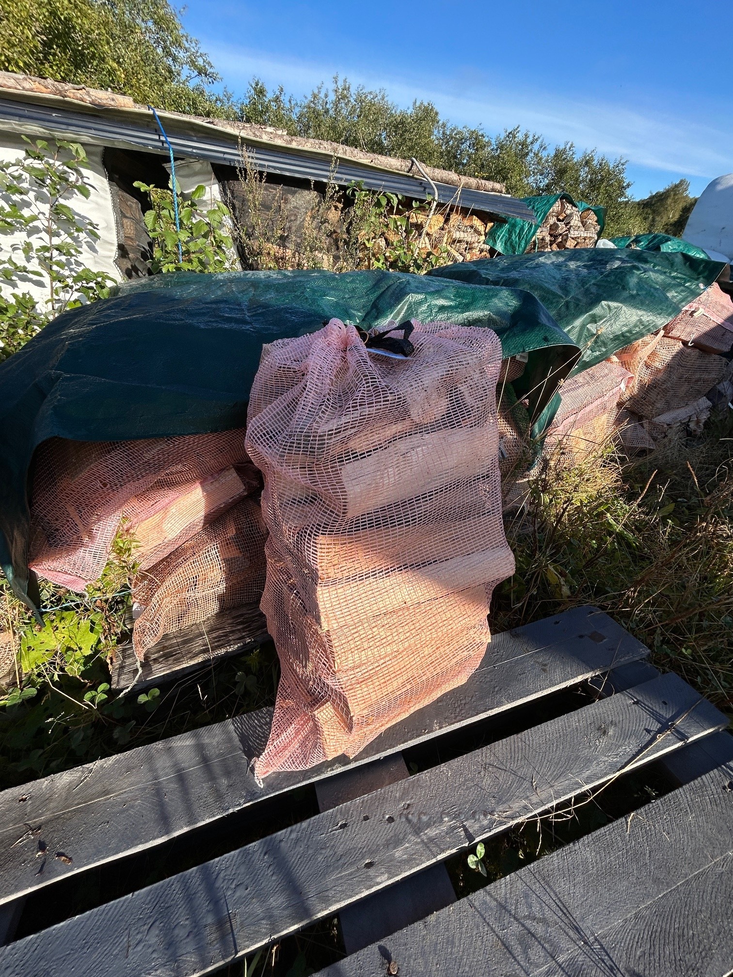 Her på STO har vi klyvd og pakket ved i sekker og laget tennbrikketter som nå skal selges.