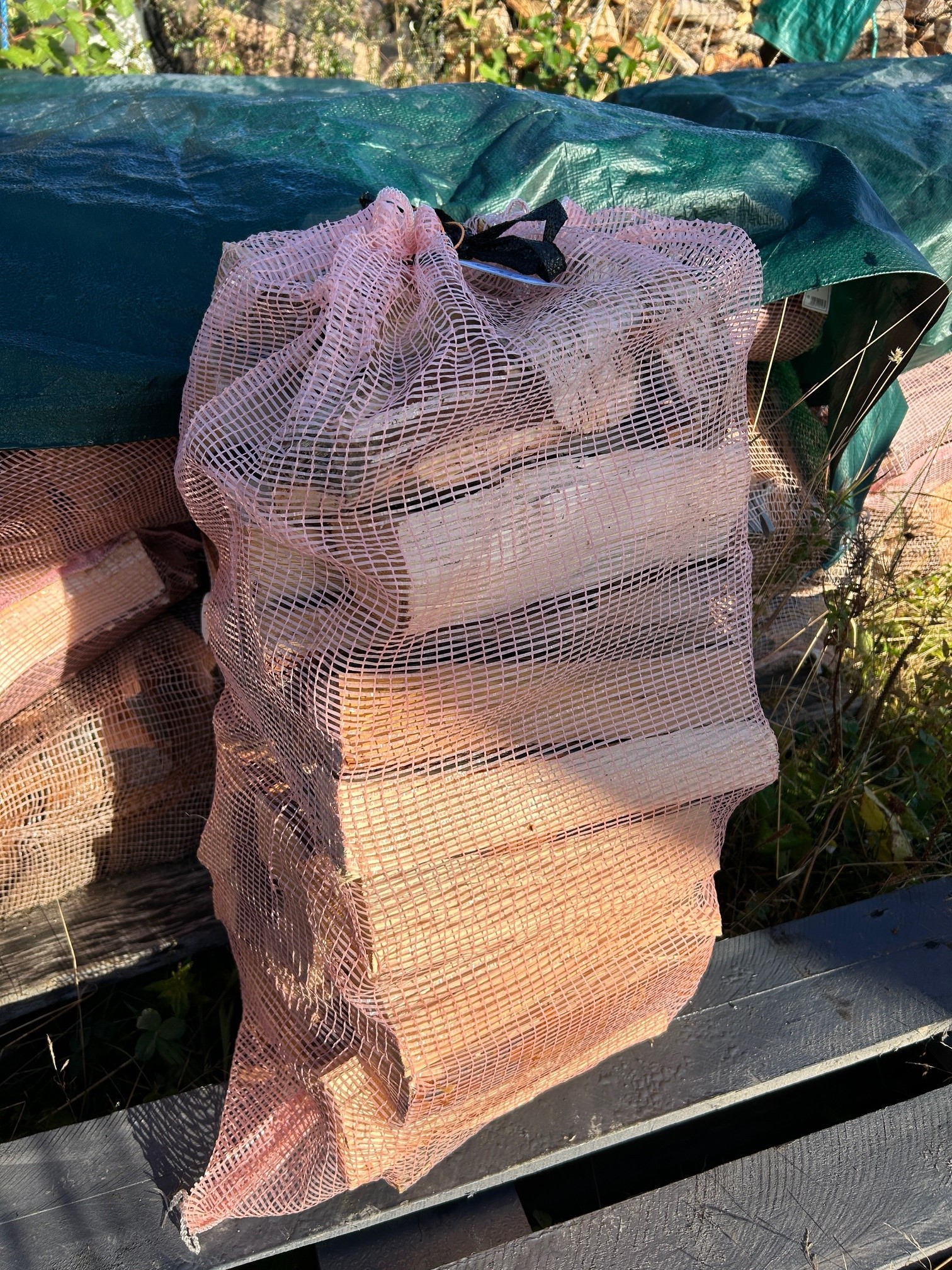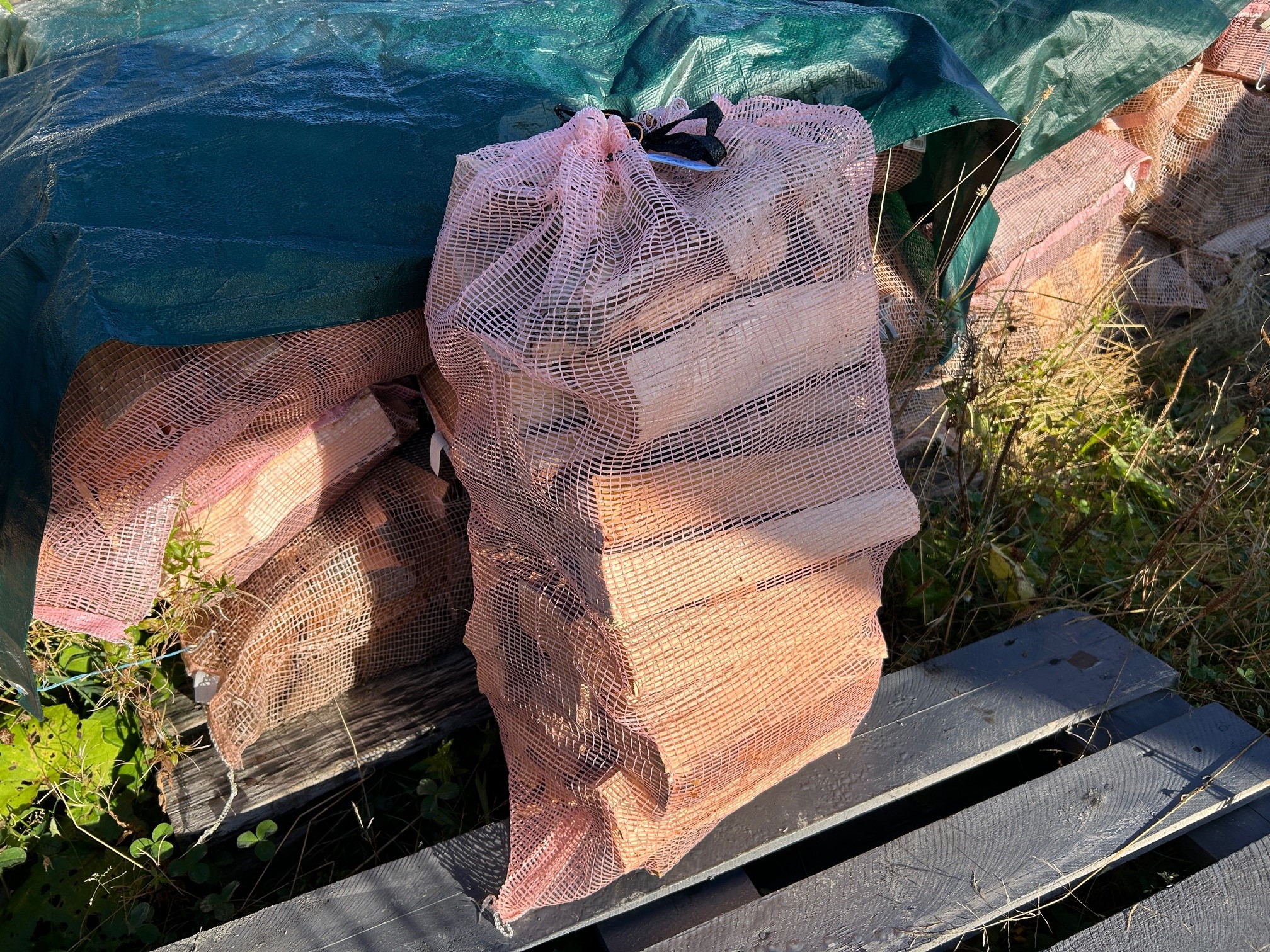 Her på STO har vi klyvd og pakket ved i sekker og laget tennbrikketter som nå skal selges.